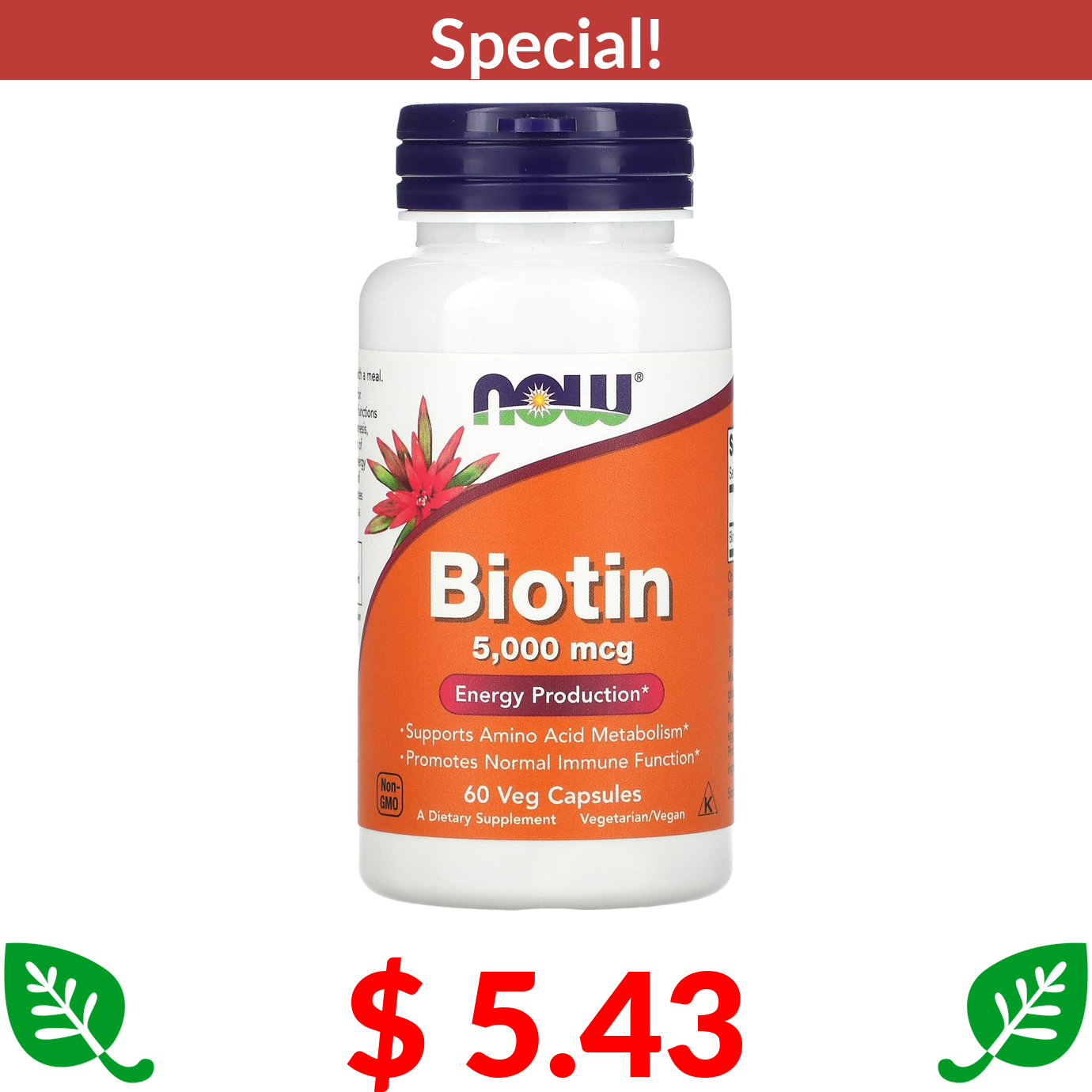 $ 5.43 NOW Foods, Biotin, 5,000 mcg, 60 Veg Capsules