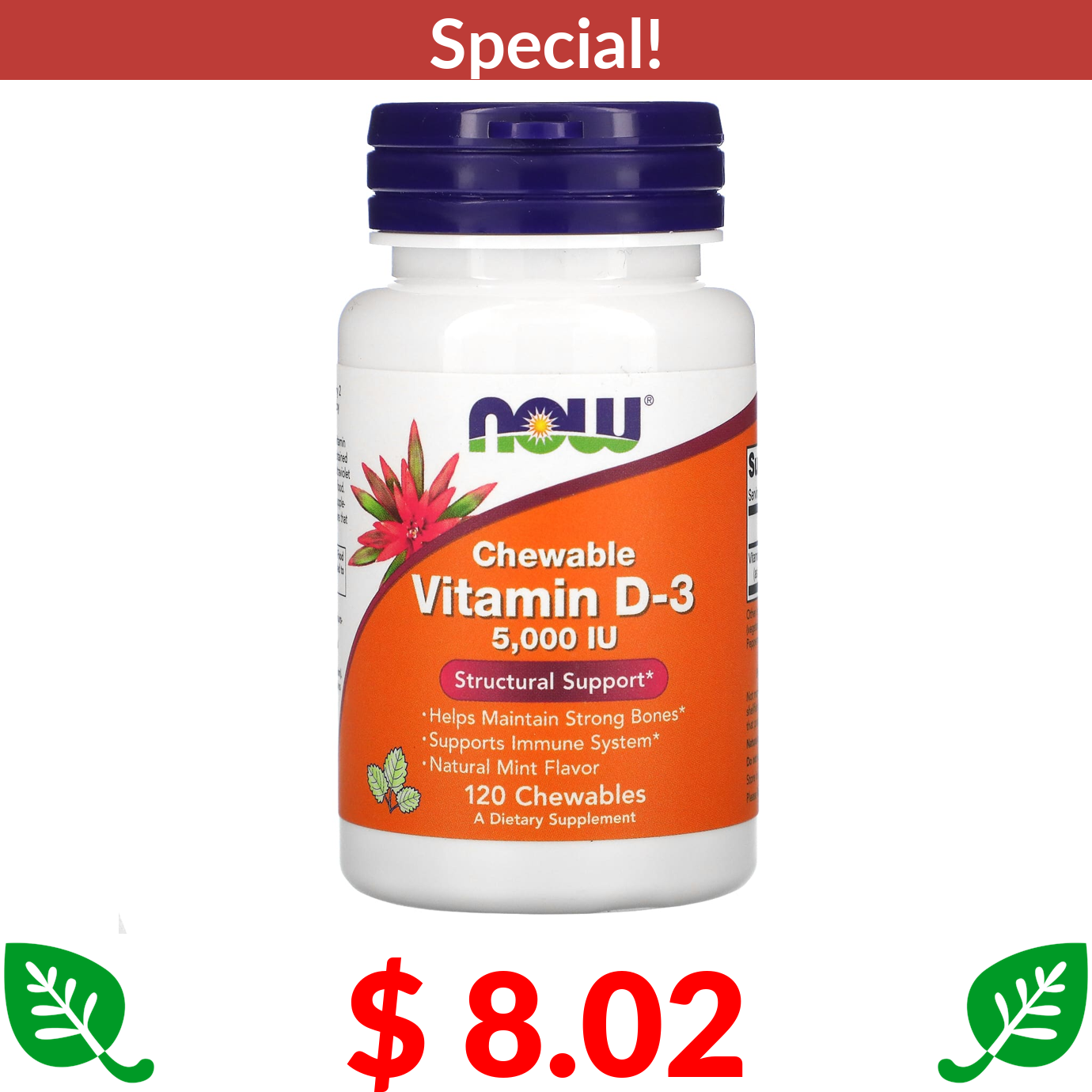 $ 8.02 NOW Foods, Chewable Vitamin D-3, Natural Mint, 5,000 IU, 120 Chewables