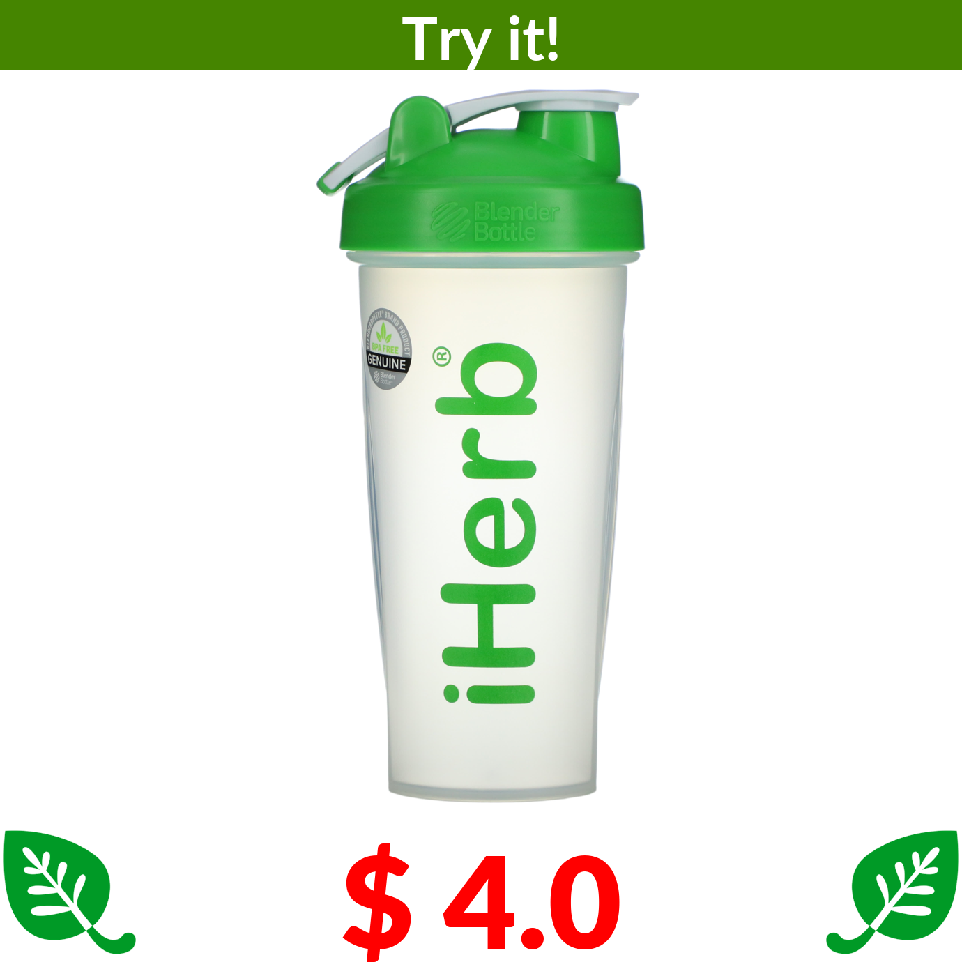 $ 4.0 iHerb Goods, iHerb Blender Bottle with Blender Ball, Green, 28 oz