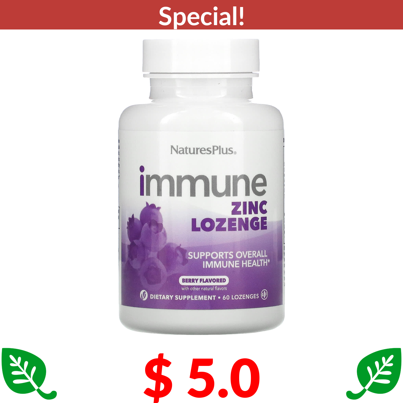 $ 5.0 NaturesPlus, Immune Zinc, Berry, 60 Lozenges