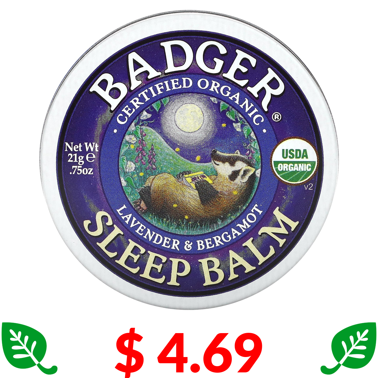 $ 4.69 Badger Company, Organic Sleep Balm, Lavender & Bergamot, 0.75 oz (21 g)