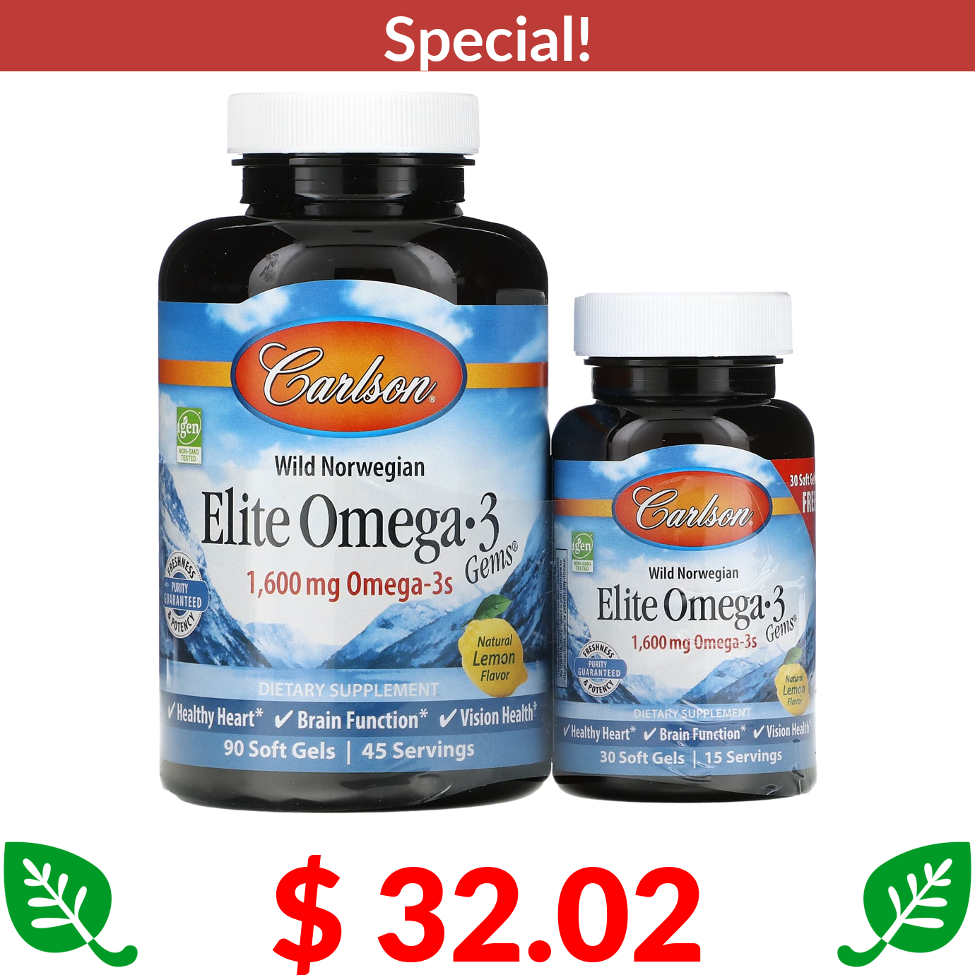 $ 32.02 Carlson, Wild Norwegian, Elite Omega-3 Gems, Natural Lemon, 800 mg, 120 Soft Gels