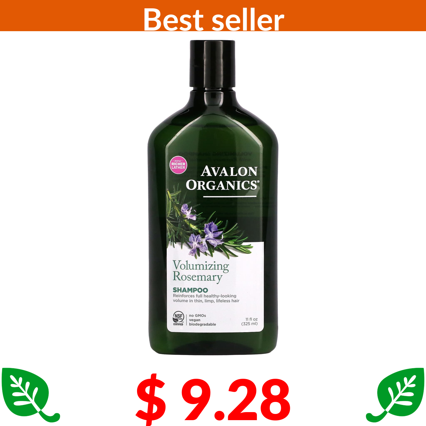 $ 9.28 Avalon Organics, Shampoo, Volumizing, Rosemary, 11 fl oz (325 ml)