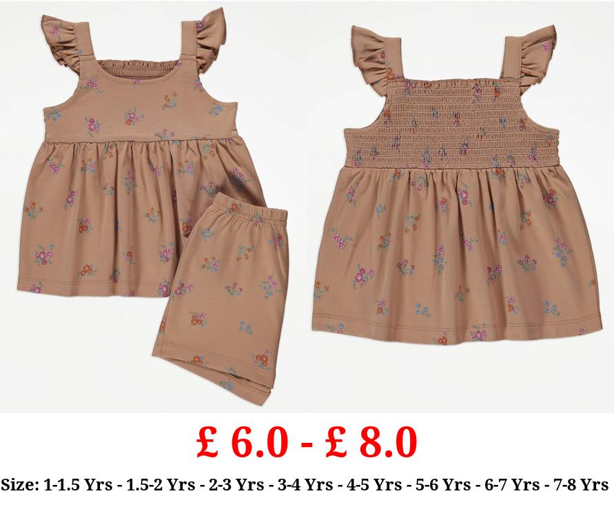 £ 6.0 - £ 8.0 Brown Floral Frill Sleeve Top and Shorts Outfit