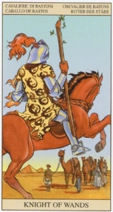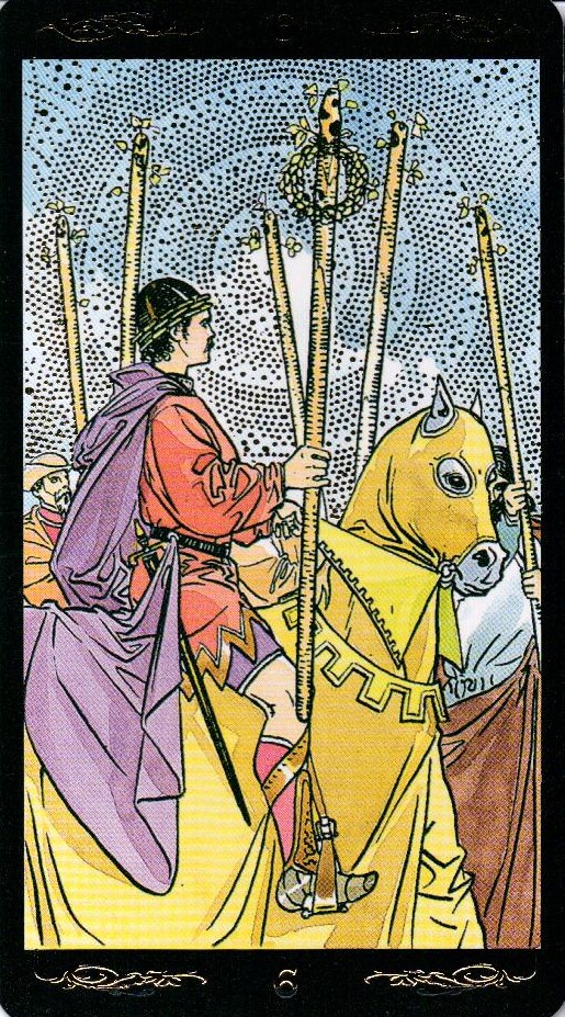 Шестерка Жезлов из колоды Райдера-Уэйта . На картинке мы видим мужчину на белом коне, который победно держит над головой посох с нанизанным на него лавровым венком .