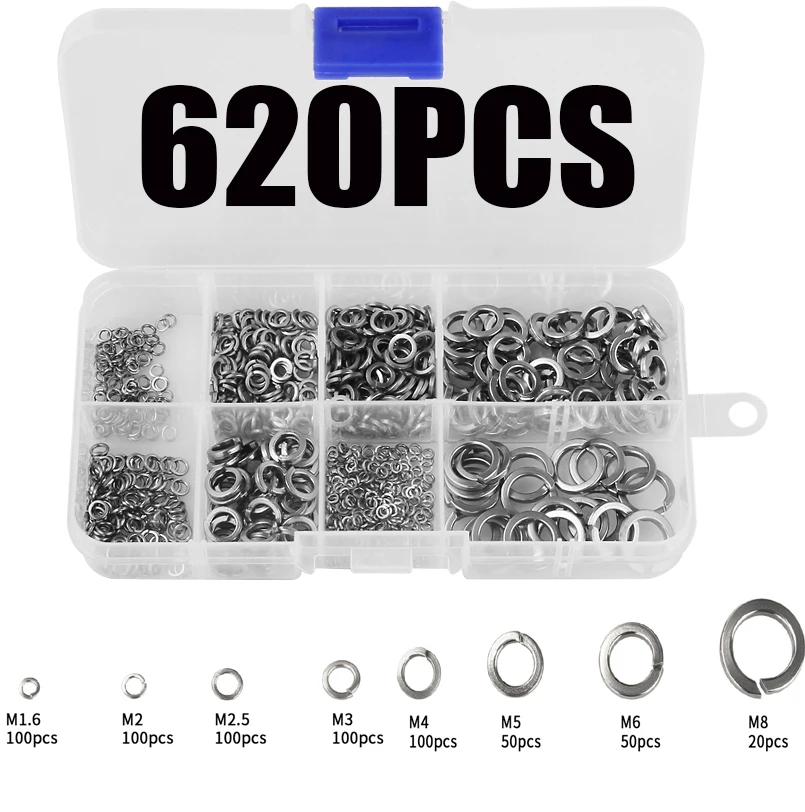 "620Pcs 304 Stainless Steel Spring Lock Washer Gasket Assortment M1.6 M2 M2.5 M3 M4 M5 M6 M8" * Buy Now Just For 4$