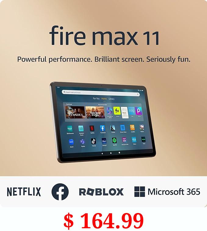 $ 164.99 Amazon Fire Max 11 tablet, our most powerful tablet yet, vivid 11" display, octa-core processor, 4 GB RAM, 14-hour battery life, 64 GB, Gray, without lockscreen ads