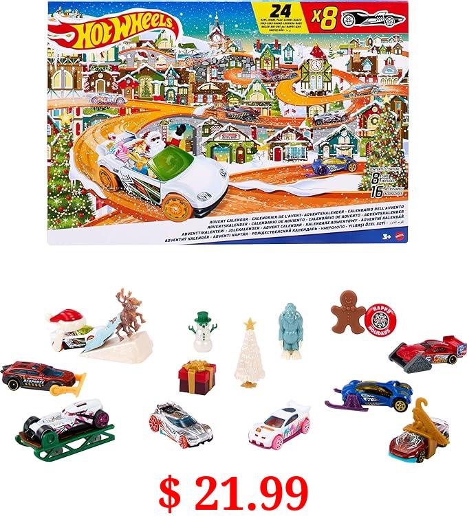 $ 21.99 Hot Wheels Toy Car Set, 2023 Advent Calendar with 8 Cars in 1:64 Scale, 16 Accessories & Playmat, Gift for Kids