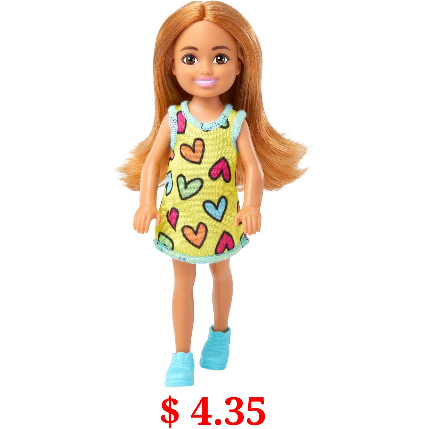 $ 4.35 Barbie Chelsea Doll, Small Doll Wearing Removable Heart-Print Dress and Shoes, Brunette Hair & Brown Eyes