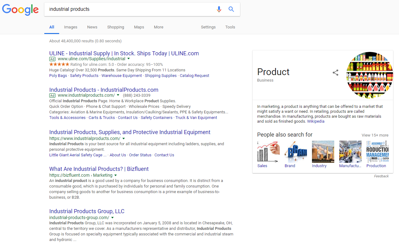 In the case of the company “Industrial Products,” even owning industrialproducts.com isn’t enough to fall hidden below competitors such as ULine and Google’s desire to define a seemingly educational search: