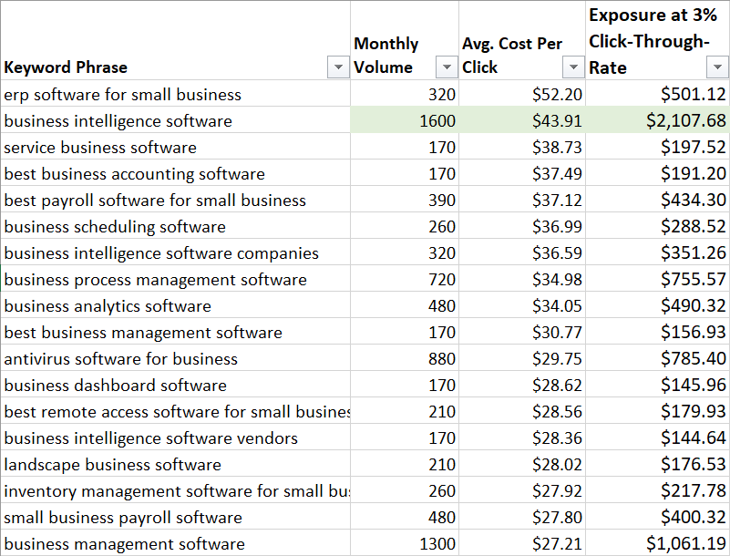 In order to get the “Exposure” column I simply take the estimated volume and multiply by the cost per click, then multiply by 3 percent which is a moderate expected click-through rate.
