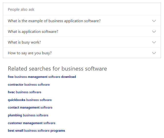 Bing and Google use “People also ask” and “Related Searches” effectively to provide closely-associated terms.