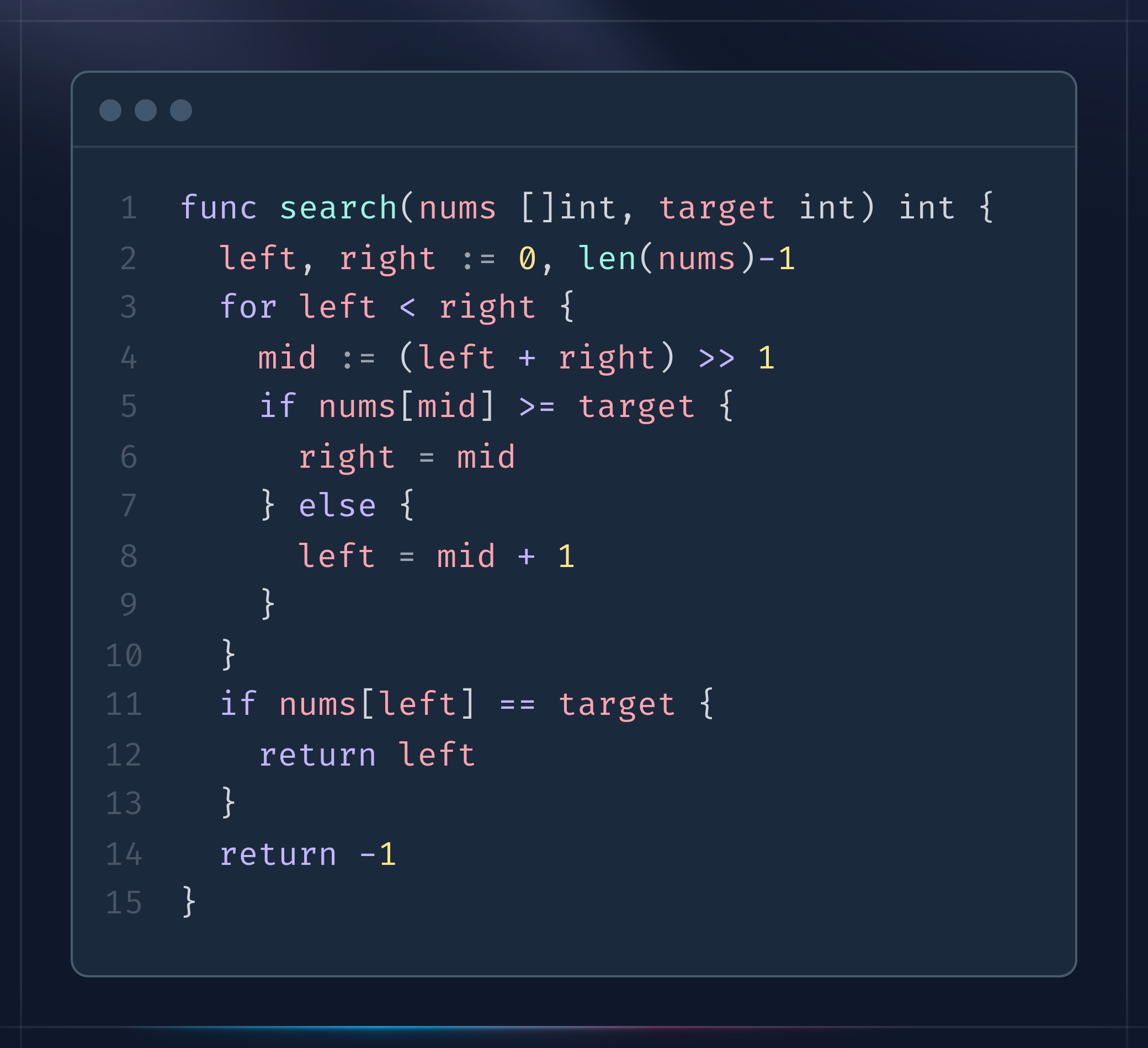 در هر تکرار، موقعیت میانی mid = (left + right) / 2 را محاسبه میکنیم و سپس اندازه nums[mid] و target را مقایسه میکنیم: