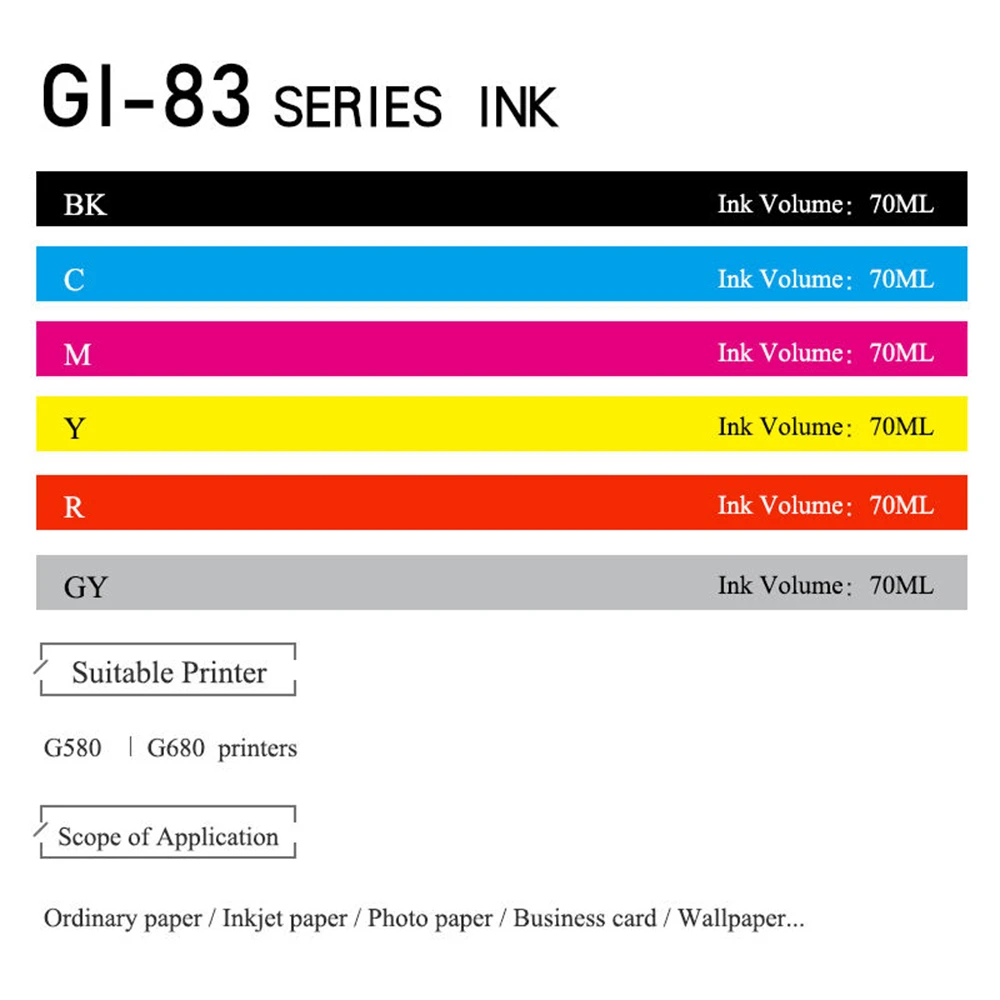 rMuiwyuPHere you can buy 70ML/bottle 6 Colors Refill Ink BK/C/M/Y/R/GY Waterbase Dye Ink Compatible for Canon G580 G680 Digital Inkjet Printers with free delivery to your post office.