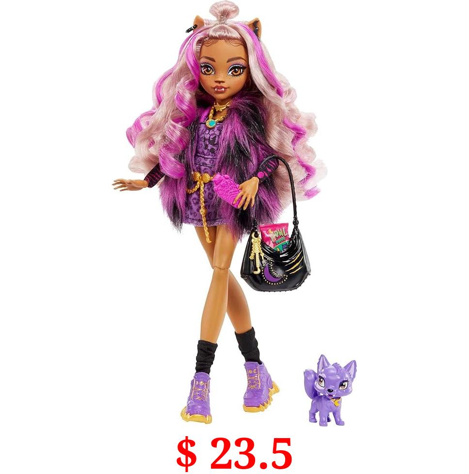 $ 23.5 Monster High Doll, Clawdeen Wolf with Purple Streaked Hair in Signature Look with Fashion Accessories & Pet Dog Crescent