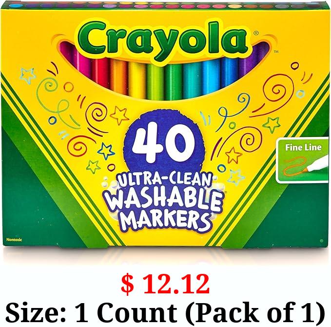 $ 12.12 Size: 1 Count (Pack of 1) Crayola Ultra Clean Fine Line Washable Markers (40ct), Colored Markers for Kids, Fine Tip Art Marker Set, Kids Craft Supplies, 3+