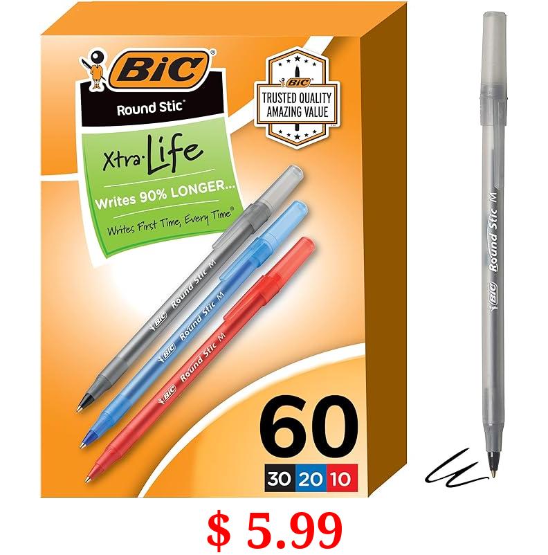 $ 5.99 BIC Round Stic Xtra Life Assorted Ink Ballpoint Pens, Medium Point (1.0mm), 60-Count Pack of Bulk Pens, Flexible Round Barrel for Comfortable Writing, No. 1 Selling Ballpoint Pens