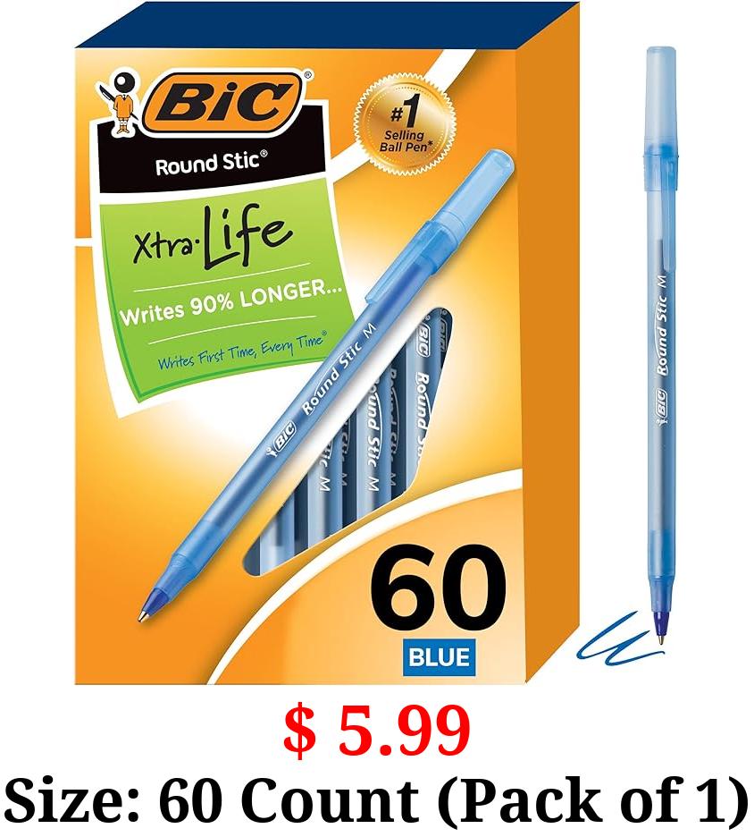 $ 5.99 Size: 60 Count (Pack of 1) BIC Round Stic Xtra Life Blue Ballpoint Pens, Medium Point (1.0mm), 60-Count Pack of Bulk Pens, Flexible Round Barrel for Writing Comfort, No. 1 Selling Ballpoint Pens