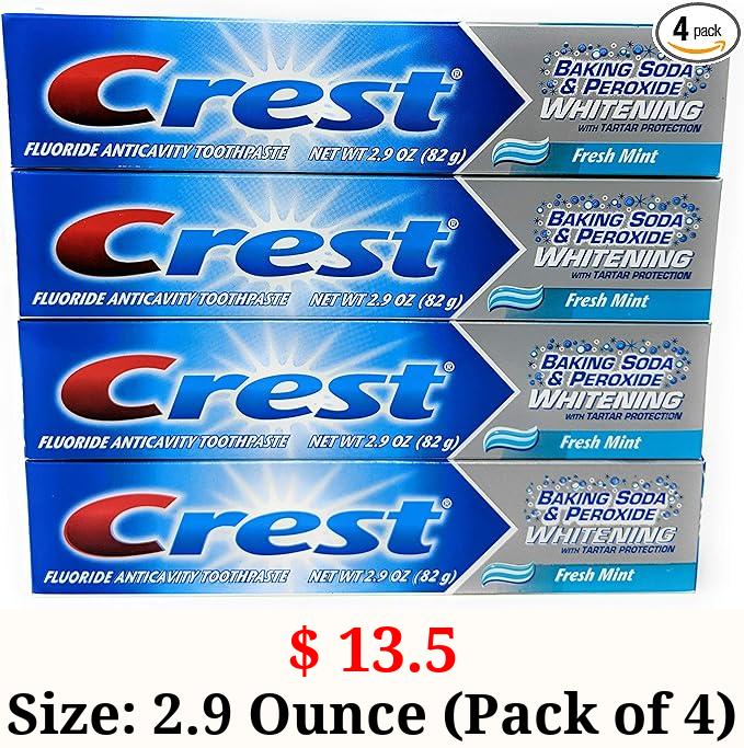 $ 13.5 Size: 2.9 Ounce (Pack of 4) Crest Baking Soda Peroxide Whitening Tartar Toothpaste, 2.9 Oz, Fresh Mint, Pack of 4