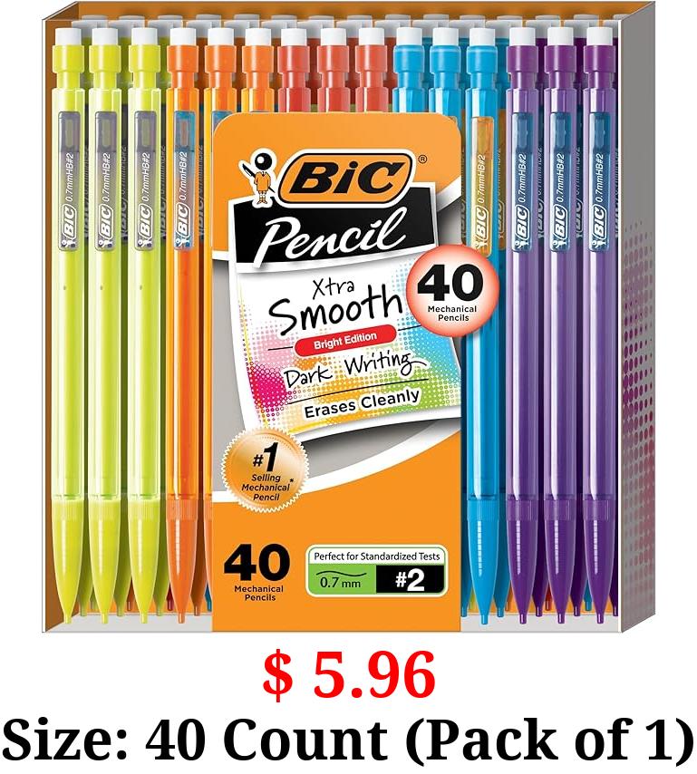 $ 5.96 Size: 40 Count (Pack of 1) BIC Xtra-Smooth Mechanical Pencils with Erasers (MPCE40-BLK), Bright Edition Medium Point (0.7mm), 40-Count Pack, Bulk Mechanical Pencils for School, Barrel Colors May Vary