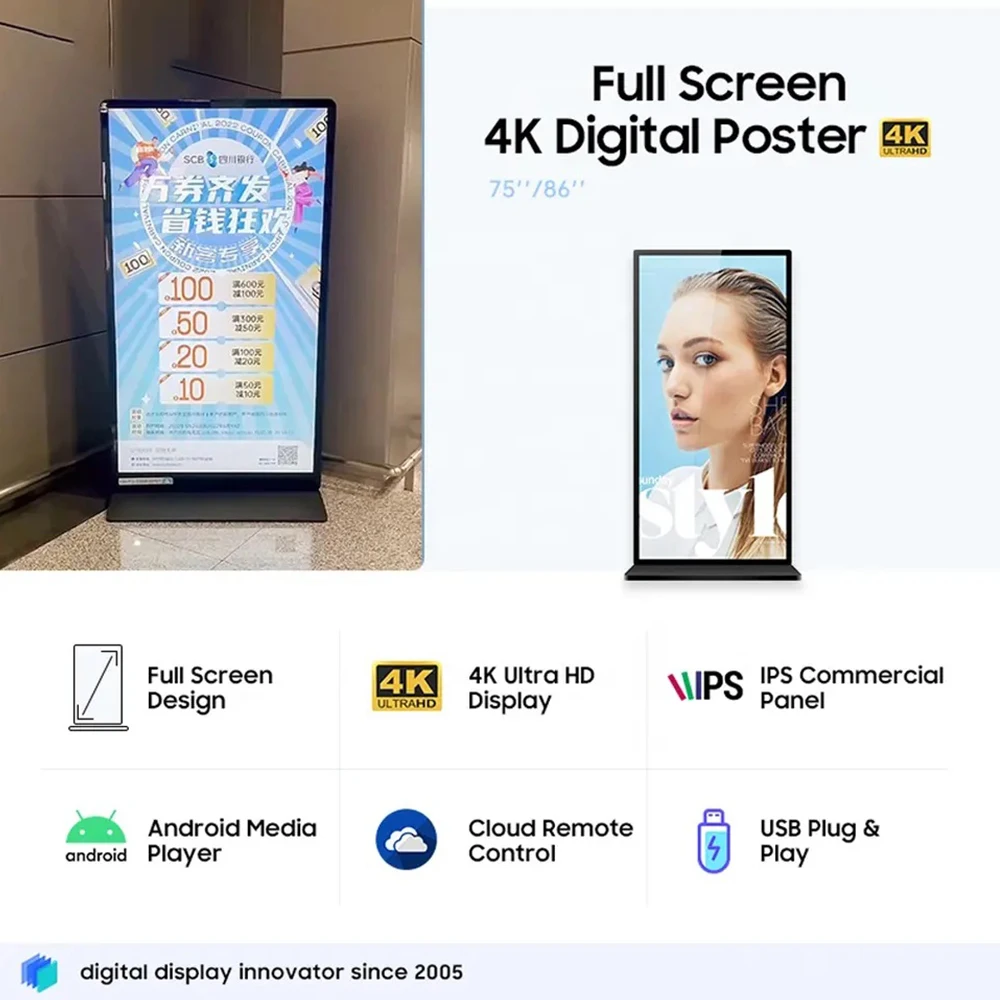 pPpIPgVYDHere you can buy 75 Inch Full Screen Indoor 4K Ads Display Floor Standing Advertising Player Info Poster WIFI Android LCD Digital Signage Kiosk with free delivery to your post office.