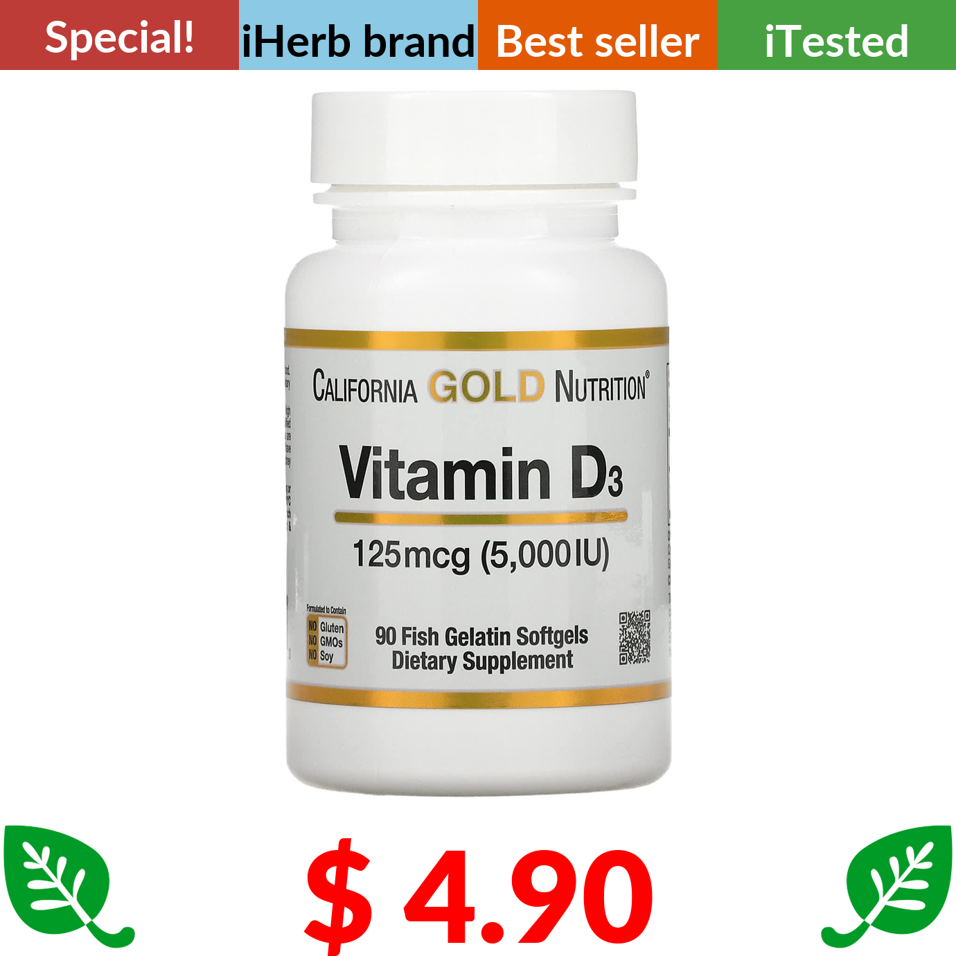 $ 4.90 California Gold Nutrition, Vitamin D3, 125 mcg (5,000 IU), 90 Fish Gelatin Softgels