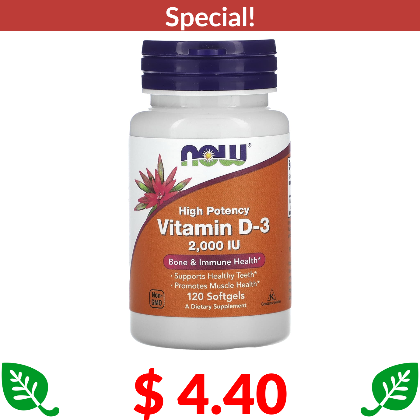 $ 4.40 NOW Foods, Vitamin D-3, High Potency, 50 mcg (2,000 IU), 120 Softgels