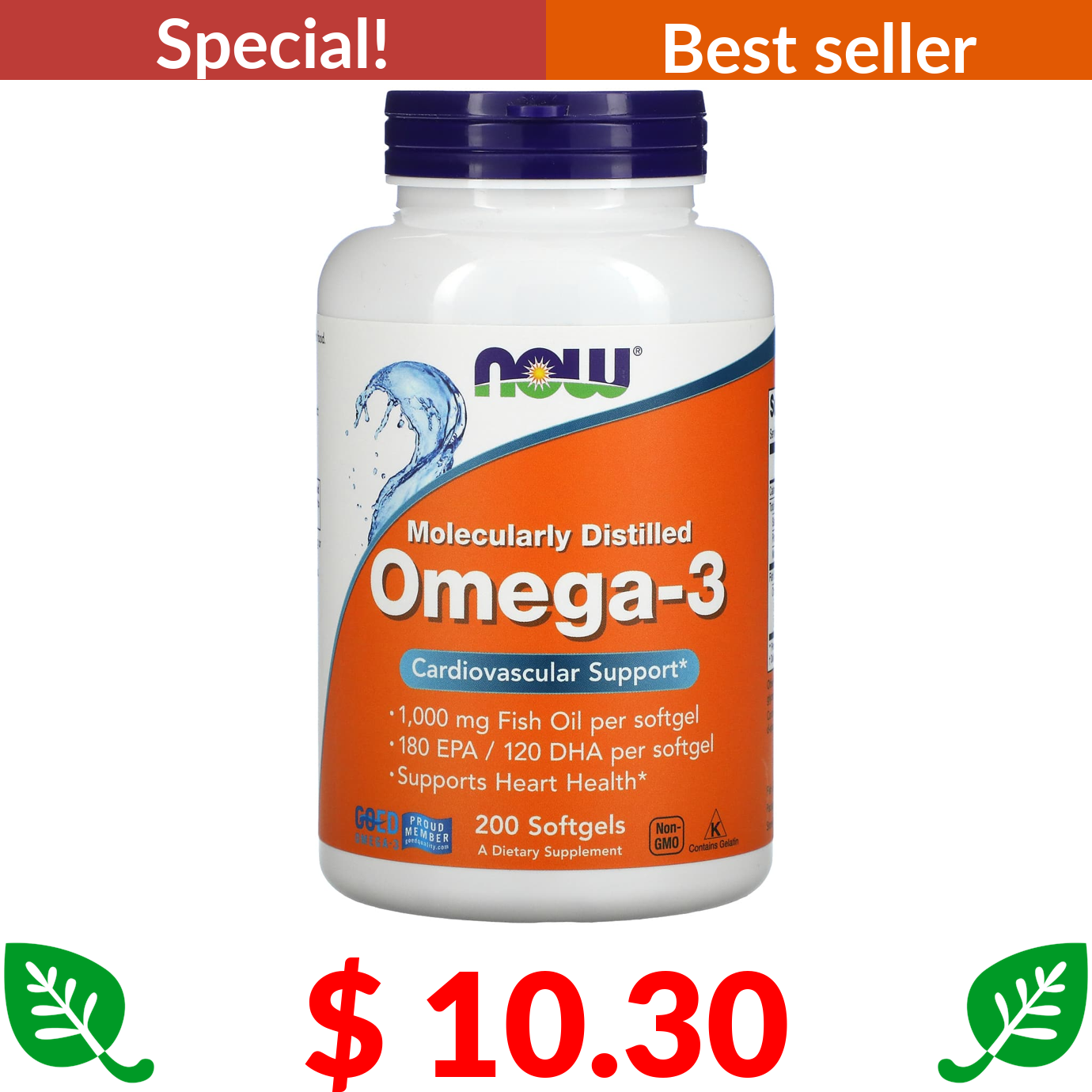 $ 10.30 NOW Foods, Omega-3, 180 EPA /120 DHA, 200 Softgels