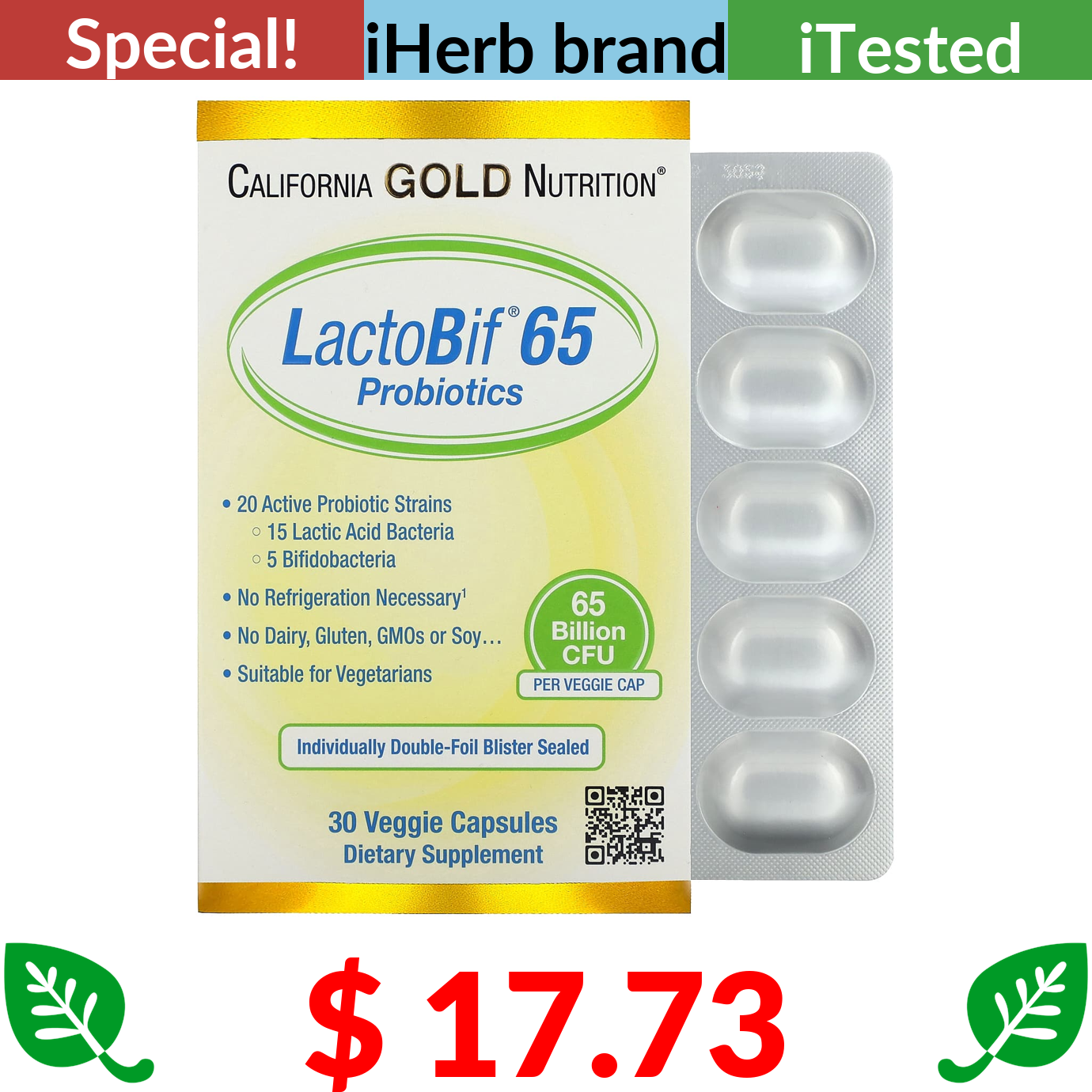 $ 17.73 California Gold Nutrition, LactoBif 65 Probiotics, 65 Billion CFU, 30 Veggie Capsules