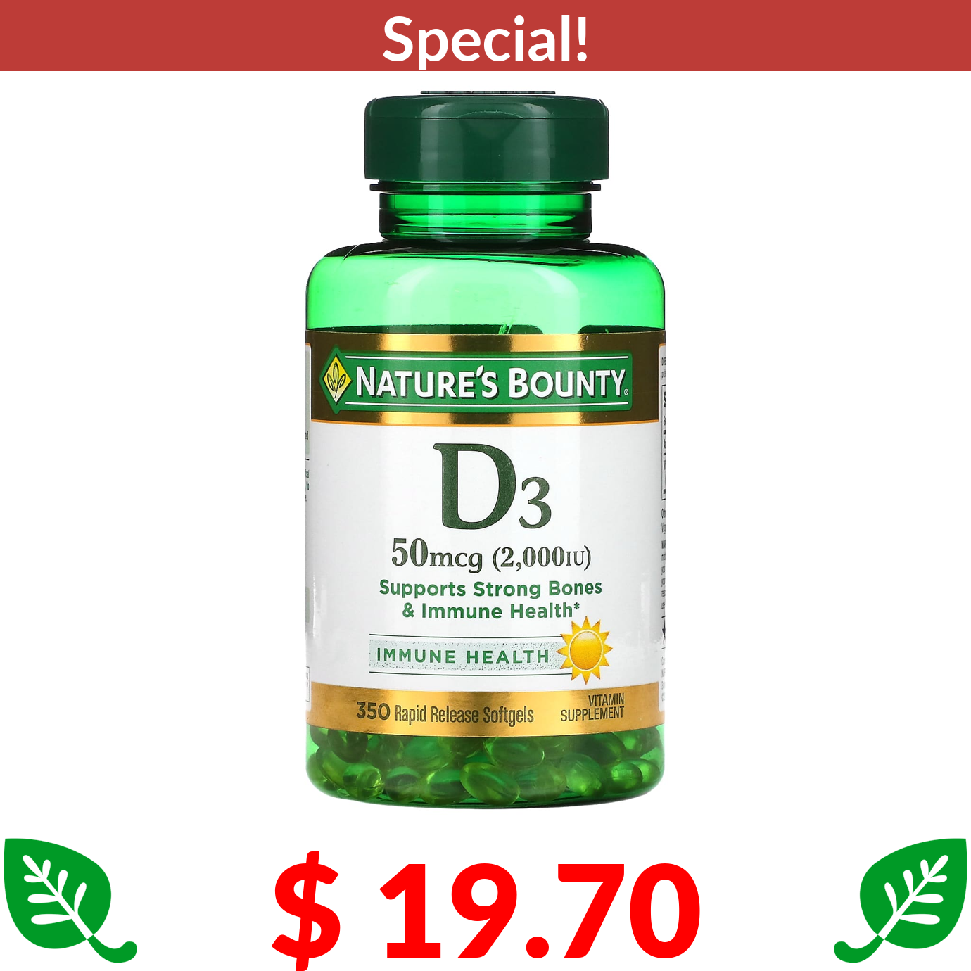 $ 19.70 Nature's Bounty, D3, 50 mcg (2,000 IU), 350 Rapid Release Softgels