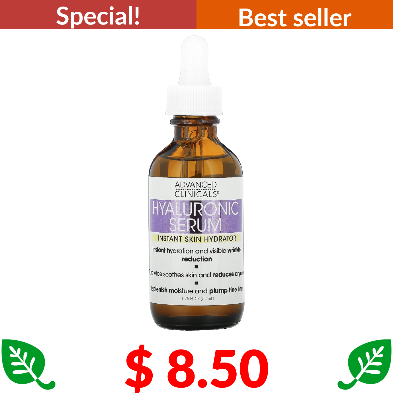 $ 8.50 Advanced Clinicals, Hyaluronic Serum, Instant Skin Hydrator, 1.75 fl oz (52 ml)