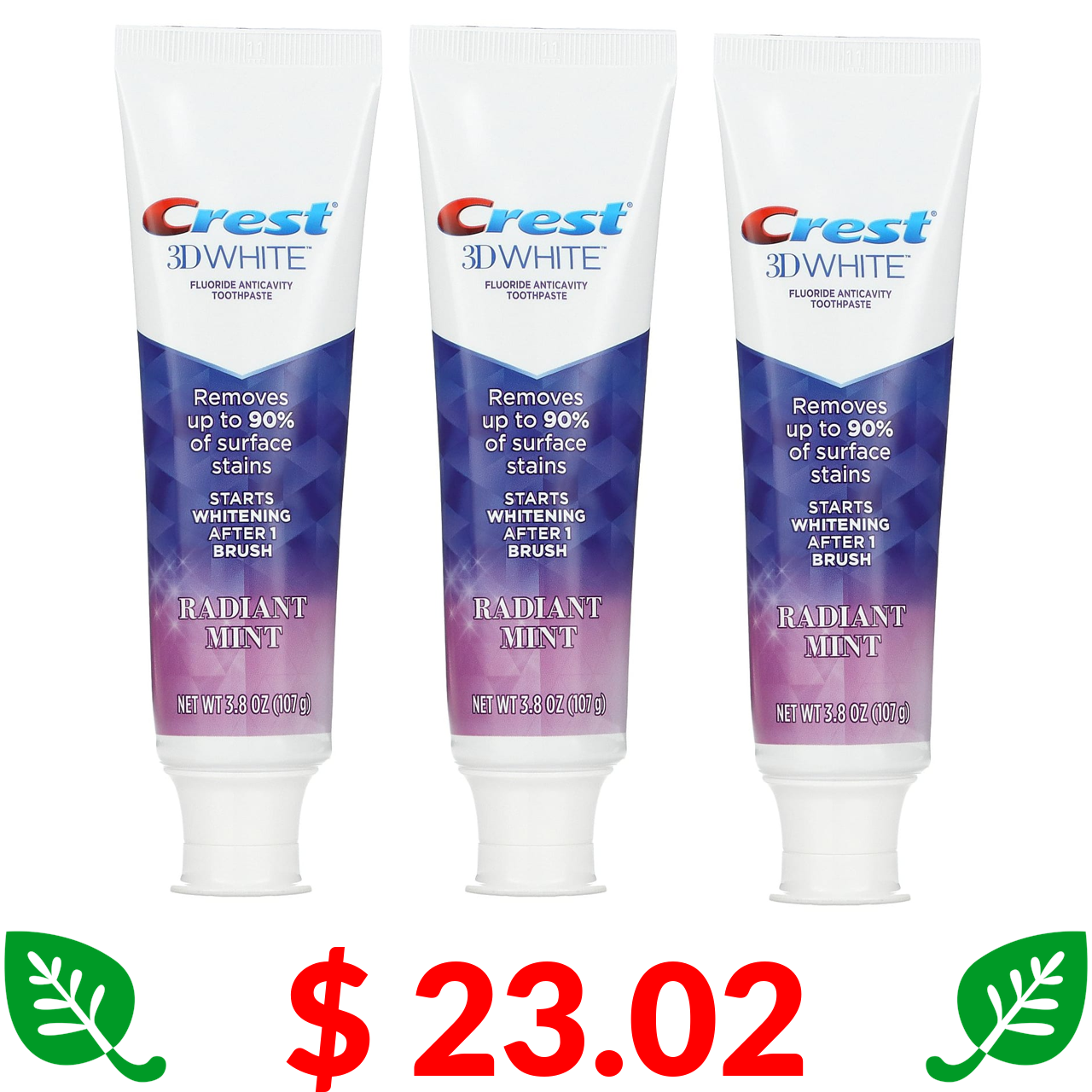 $ 23.02 Crest, 3D White, Fluoride Anticavity Toothpaste, Radiant Mint, 3 Pack, 3.8 oz (107 g) Each