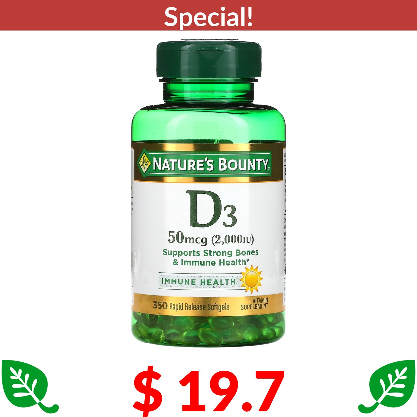 $ 19.7 Nature's Bounty, D3, 50 mcg (2,000 IU), 350 Rapid Release Softgels