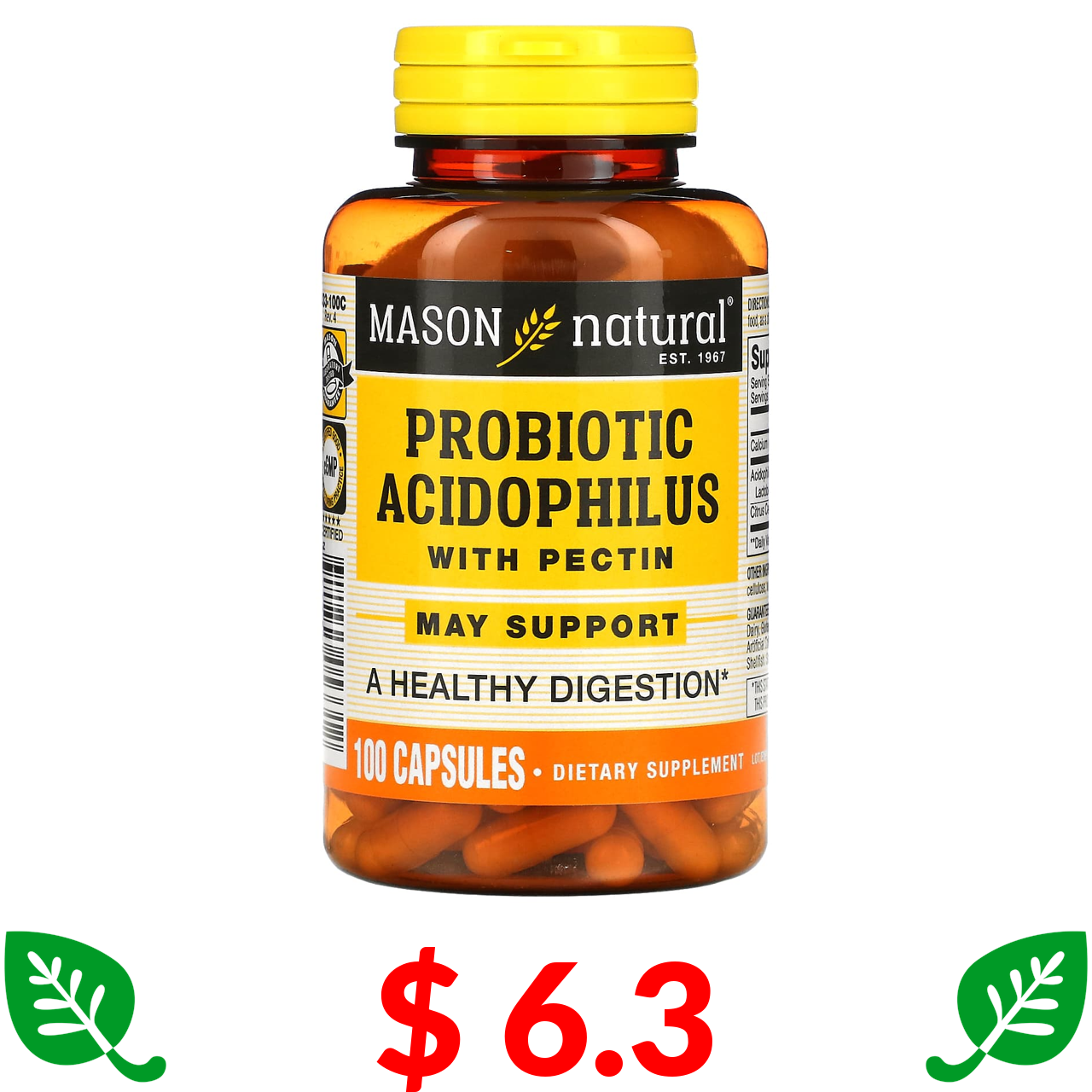 $ 6.3 Mason Natural, Probiotic Acidophilus with Pectin, 100 Capsules