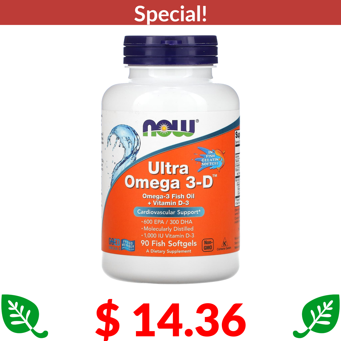 $ 14.36 NOW Foods, Ultra Omega 3-D, 600 EPA / 300 DHA, 90 Fish Softgels
