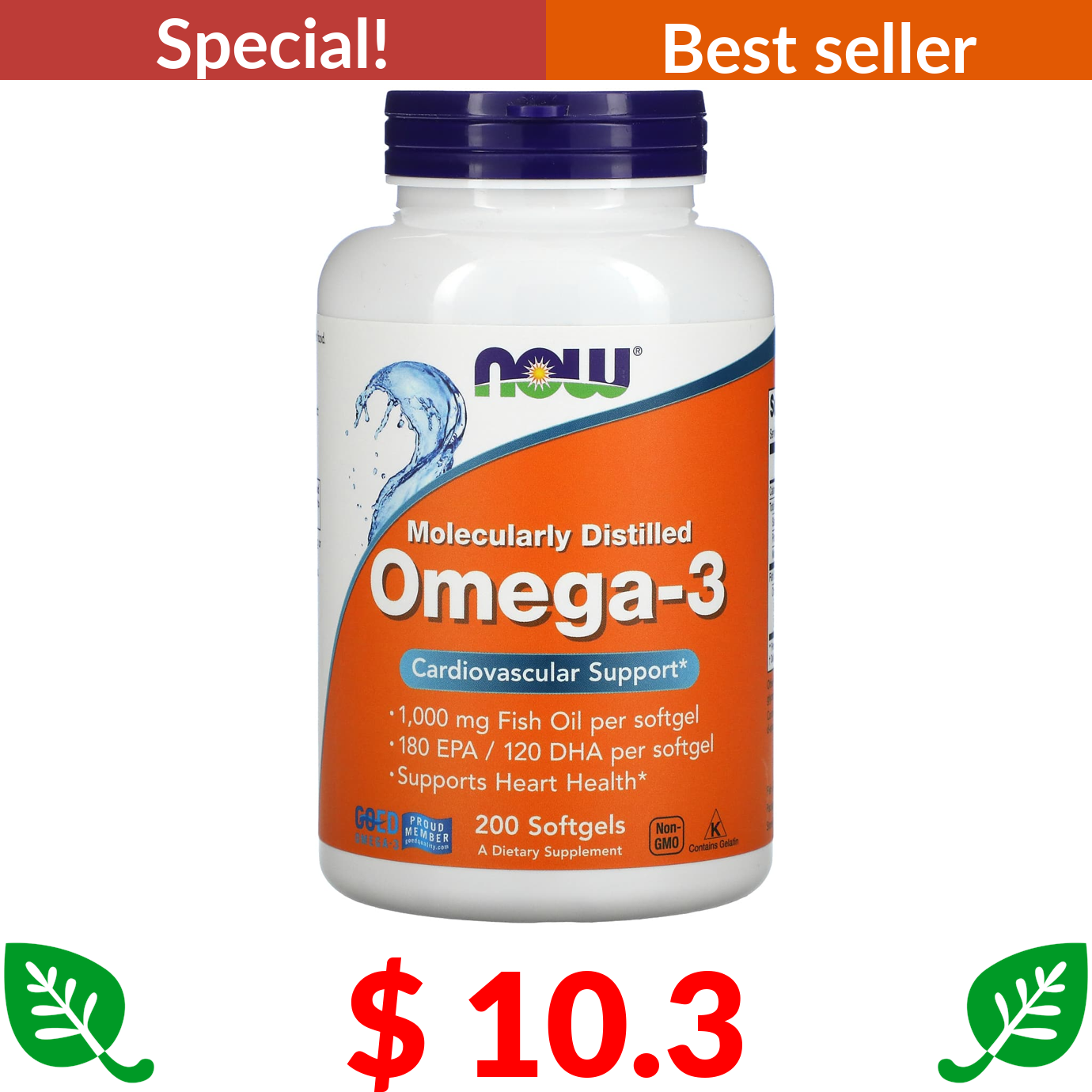 $ 10.3 NOW Foods, Omega-3, 180 EPA /120 DHA, 200 Softgels
