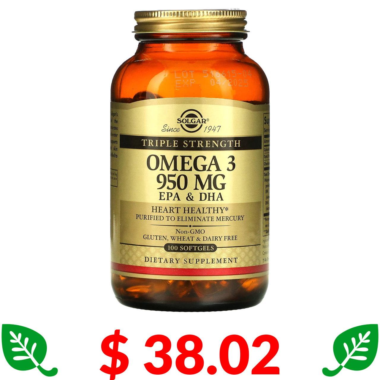 $ 38.02 Solgar, Omega 3, EPA & DHA, Triple Strength, 950 mg, 100 Softgels
