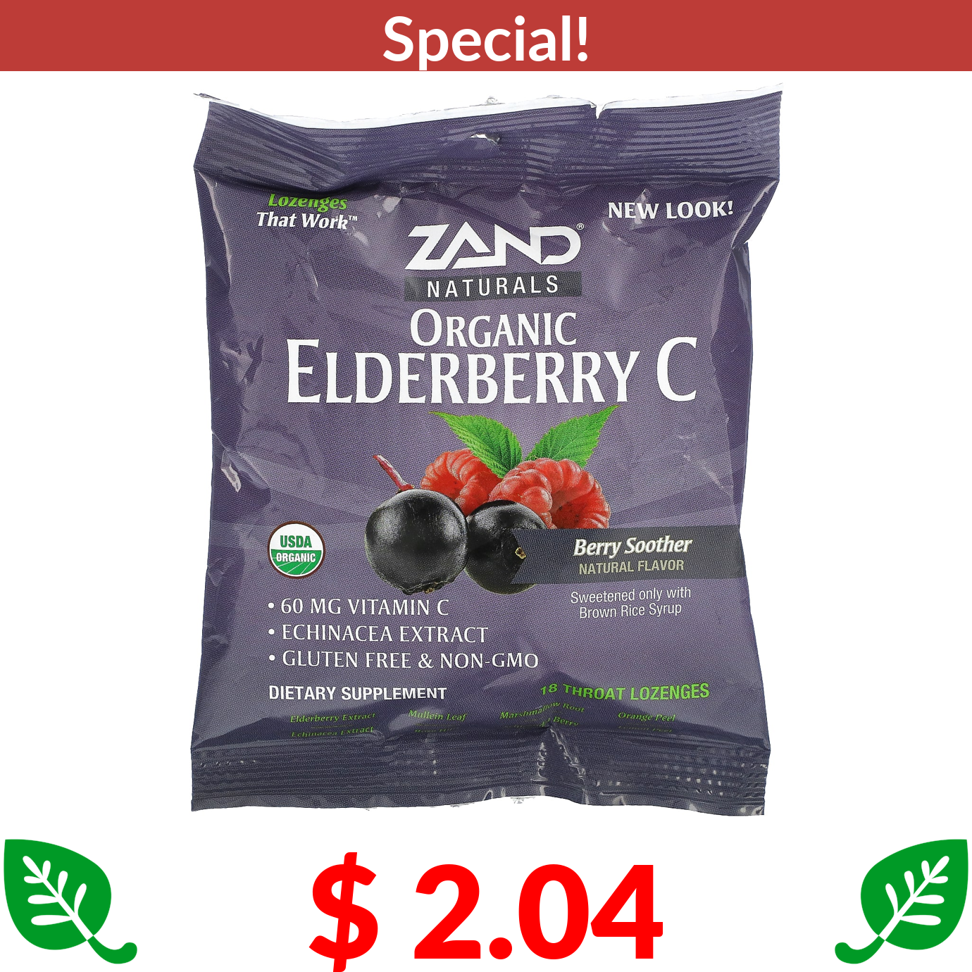 $ 2.04 Zand, Naturals, Organic Elderberry C, Berry Soother, 18 Throat Lozenges