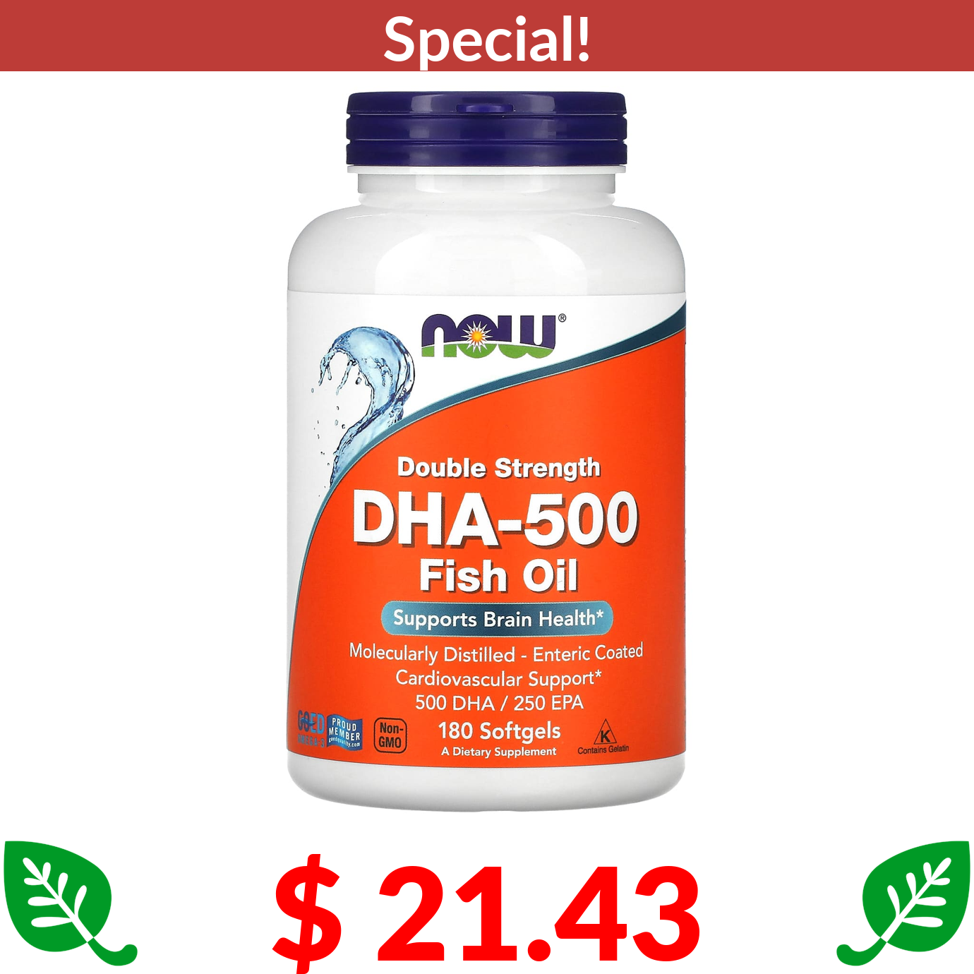 $ 21.43 NOW Foods, Double Strength DHA-500 Fish Oil, 180 Softgels