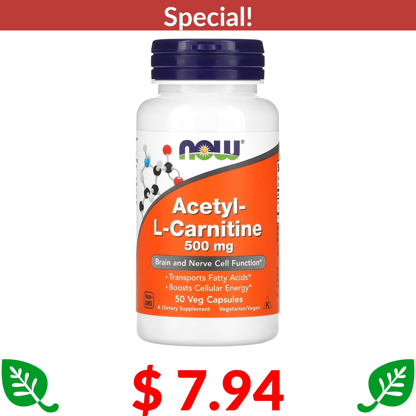 $ 7.94 NOW Foods, Acetyl-L- Carnitine, 500 mg, 50 Veg Capsules