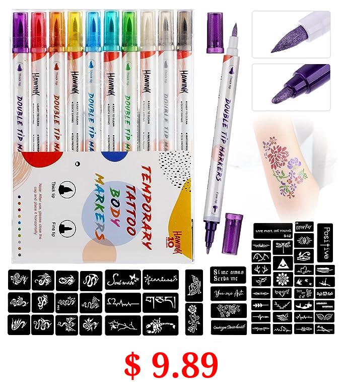 $ 9.89 HAWINK Temporary Tattoo Markers for Skin, 10 Body Markers + 56 Large Tattoo Stencils for Kids and Adults, Dual-End Tattoo Pens Make Bold and Fine Lines with Cosmetic-Grade Tattoo Ink ZYH2208001KIT