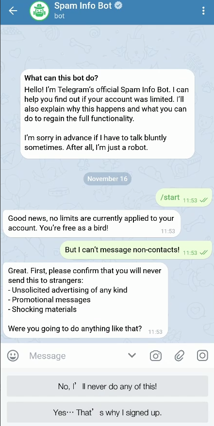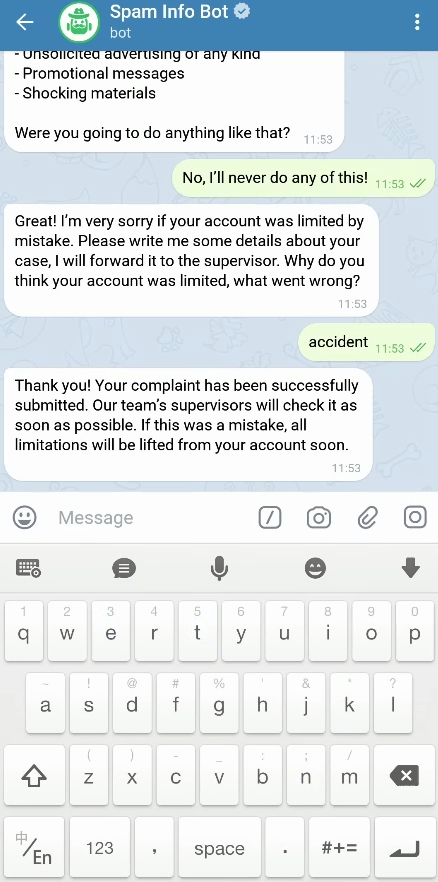 向官方 @SpamBot 发送消息申请(跟着提示操作就行)