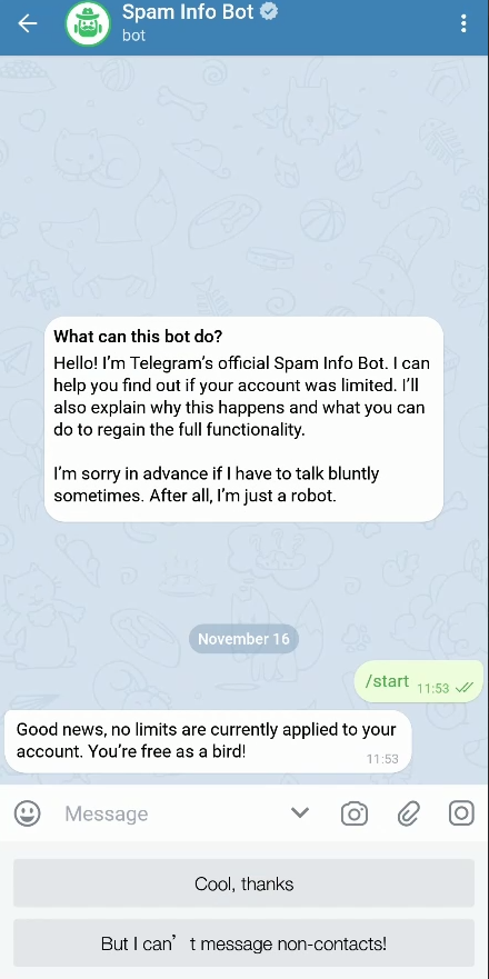 当你无法私聊个人时说明你已经被telegram官方限制了