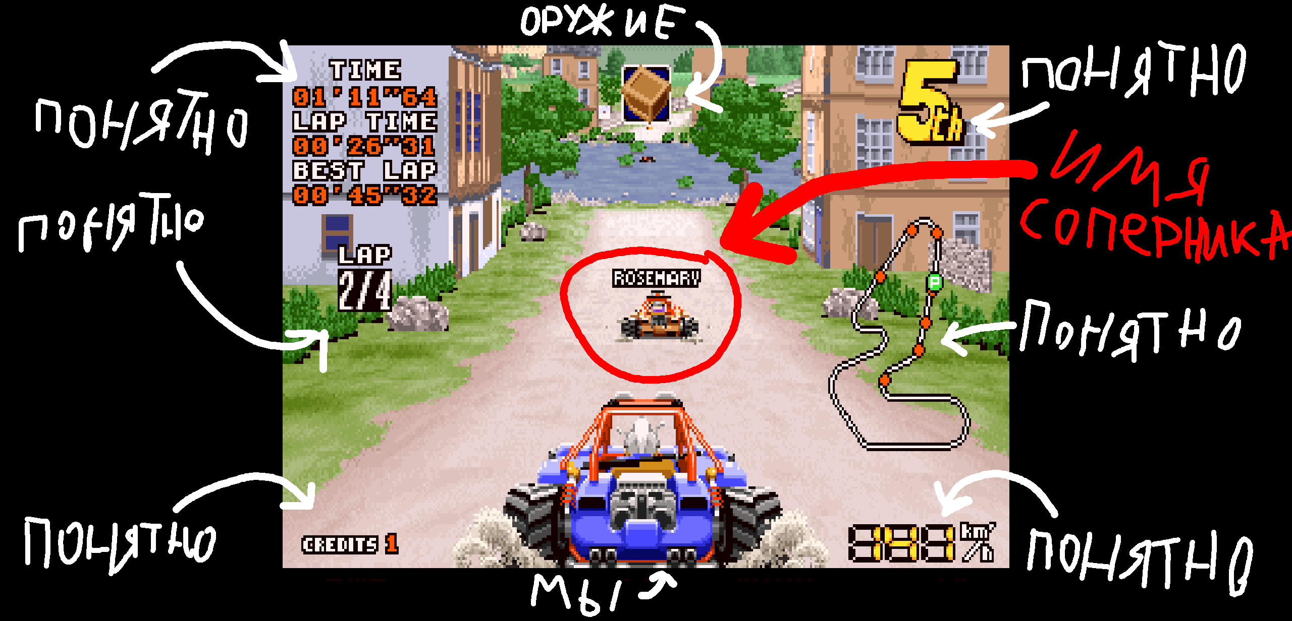 - На трассе где-то есть место где выдают "оружие". Либо самонаводящаяся бомба которая в 60% случаях мазала. Либо коробка с какашкой, на которую в 80% случаях, сделав круг, споткнёшься сам. Но самое стрёмное оружие (попадалось один раз) это целая стенка из таких коробок. Гарантированный самоподрыв.