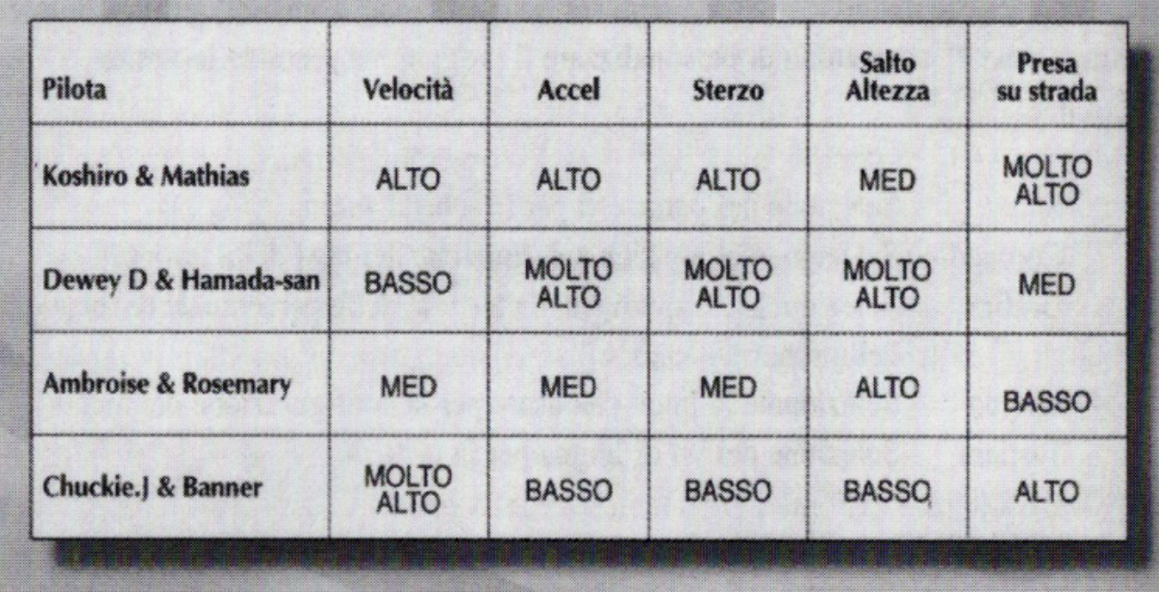 Предоставляю вашему вниманию таблицу характеристик героев ралли. Как можно заметить они поделены на парочки. Мы знаем, что Коширо и Матиас соперники, то можем то же предположить и про других. Если не знаете итальянский вот вам перевод: