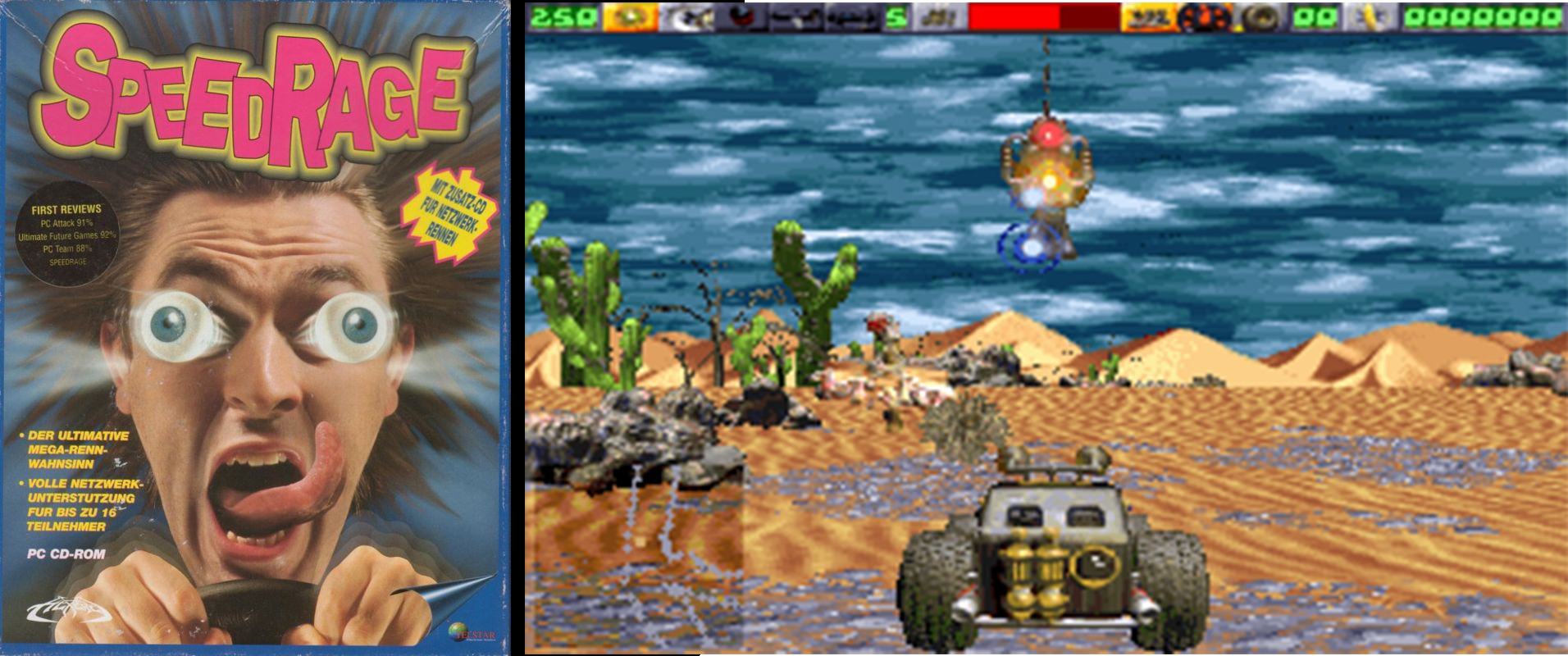 SpeedRage — аркадная гоночная игра с элементами шутера. Вы можете выбирать между двумя различными типами гонок (водными и наземными): скоростной катер или дюнный багги. Как и во многих предыдущих гоночных играх, вы смотрите на свой автомобиль сзади.