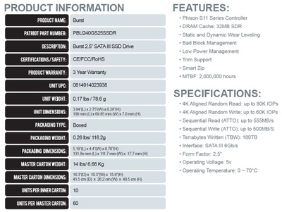 Patriot's burst SSD comes in three sizes for every user, at 120GB, 240GB, 480GB and 960GB . With the burst , Patriot has continued pricing very aggressively to offer one Of the best price-per-performance ratios on the market . Backed by Patriot's award winning build quality; The Patriot burst will deliver as one of the most reliable choices in . . .