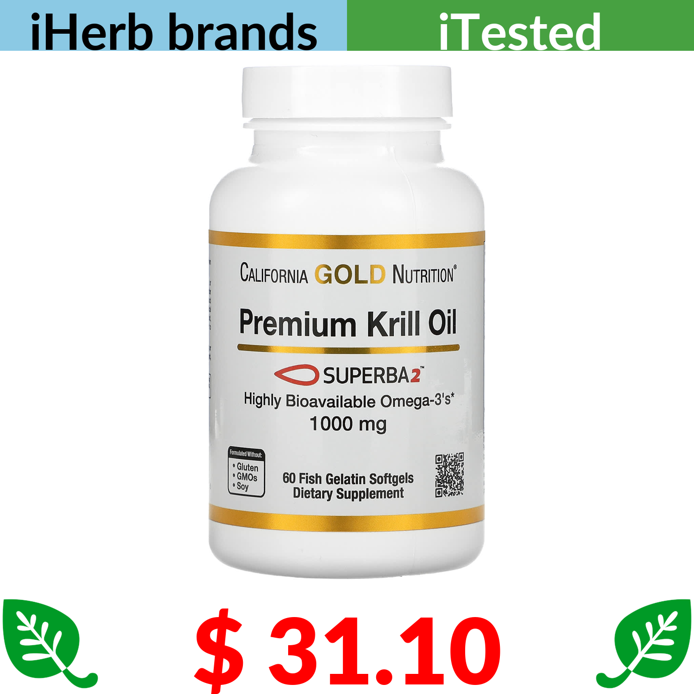 $ 31.10 California Gold Nutrition, Premium Krill Oil with Superba2, 1,000 mg, 60 Fish Gelatin Softgels