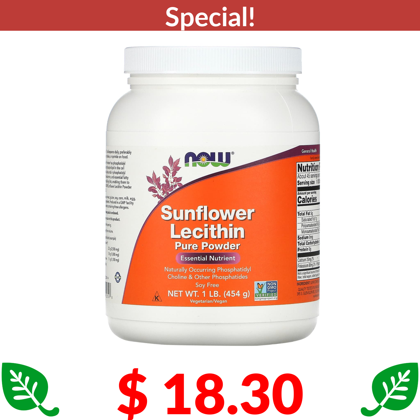 $ 18.30 NOW Foods, Sunflower Lecithin, Pure Powder, 1 lb (454 g)