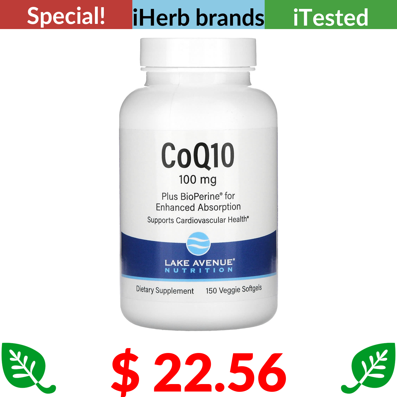 $ 22.56 Lake Avenue Nutrition, CoQ10 with Bioperine, 100 mg, 150 Softgels